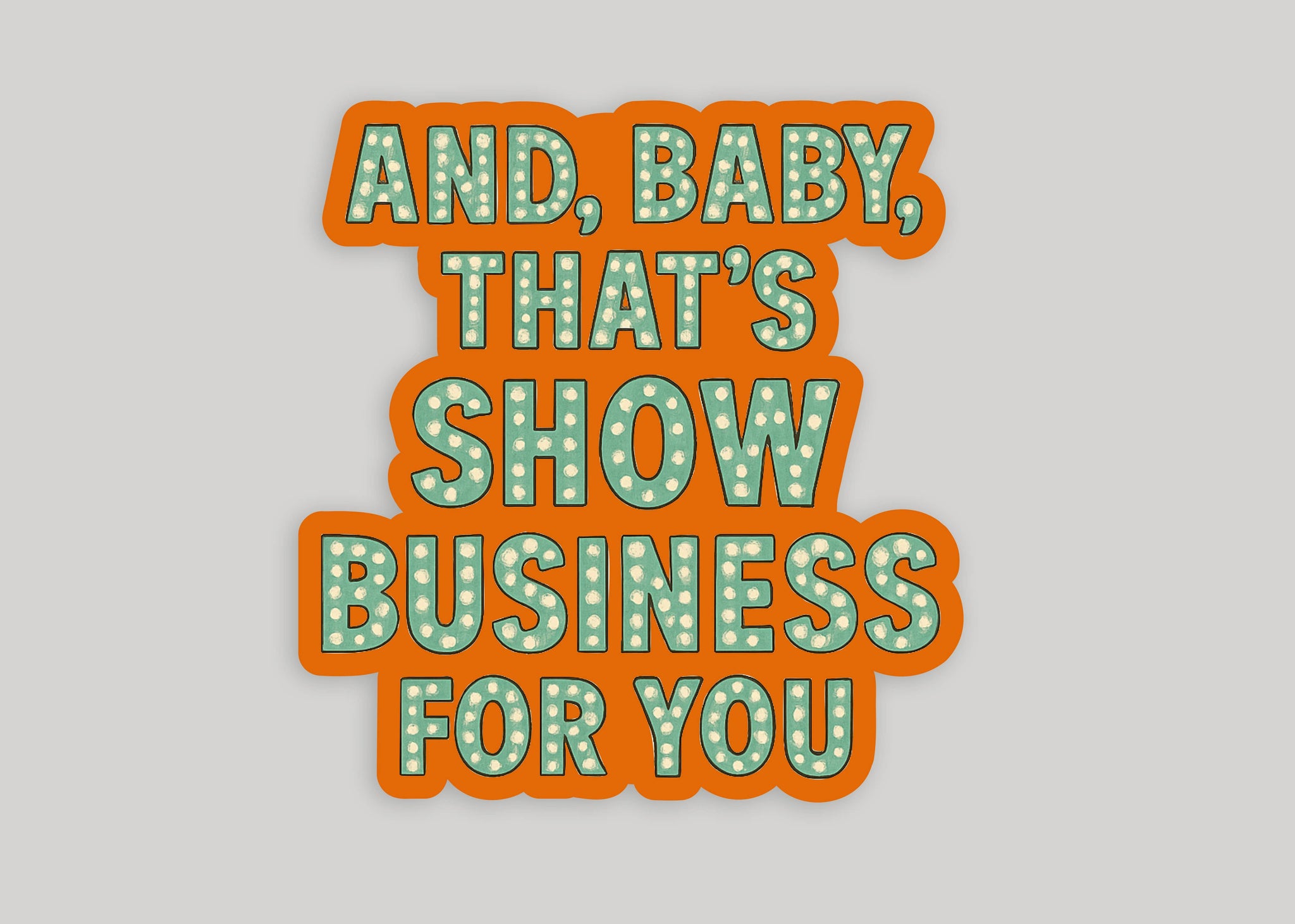 This fun sticker is perfect for your laptop, water bottle, notebook & more! This sticker has text reading "And, Baby, That's Show Business For You" in marquee lights. This sticker is sized to 3 x 2.8 inches with a glossy, water-resistant coating.