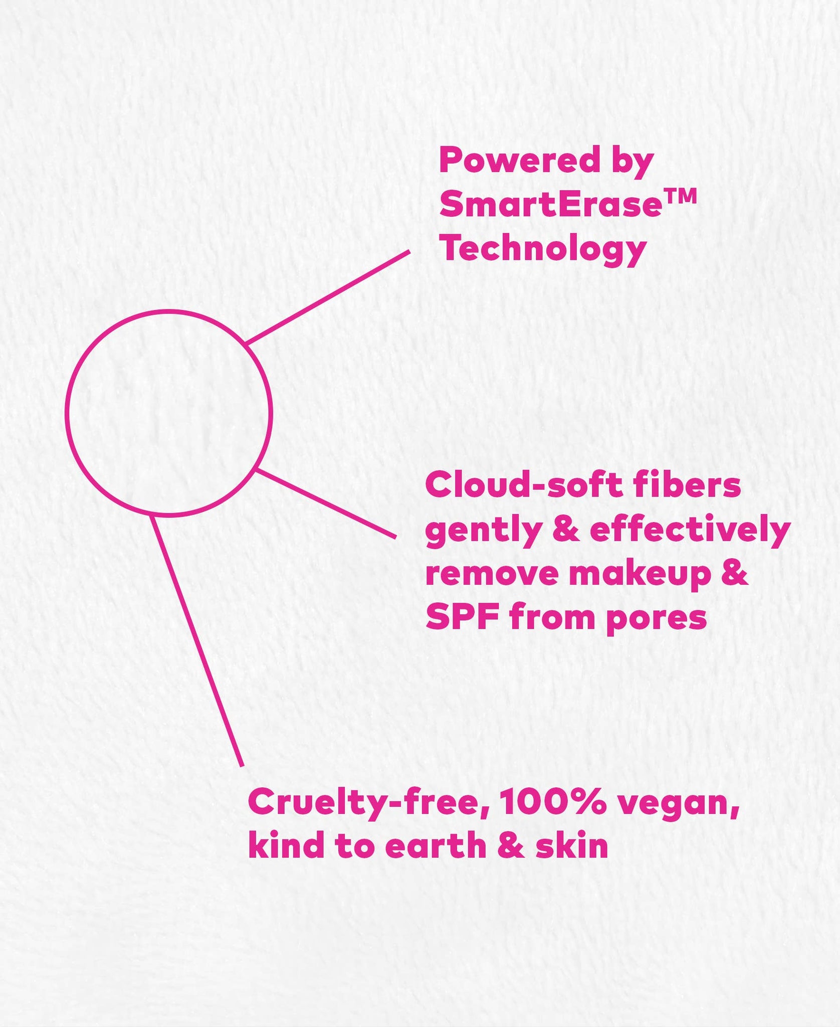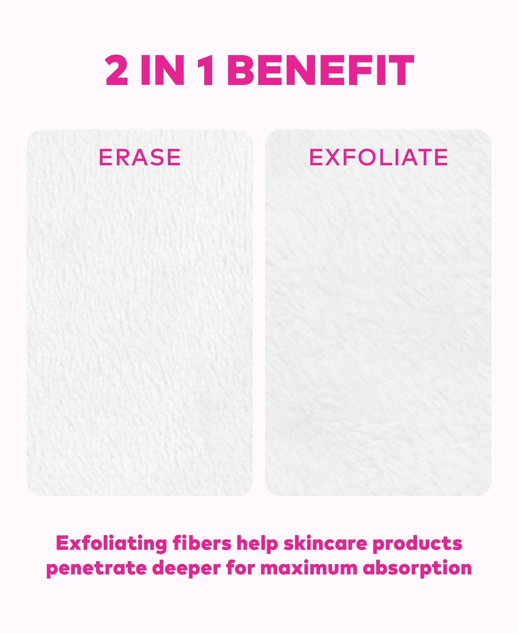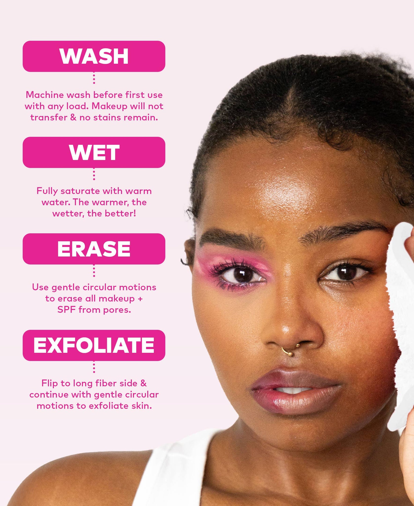 Erase all makeup with JUST WATER™ including waterproof. Our patented, water-activated makeup remover uses cloud-soft fibers to gently & easily remove all cosmetics & sunscreen from pores. 2 in 1 benefit: one side removes makeup & one side exfoliates.