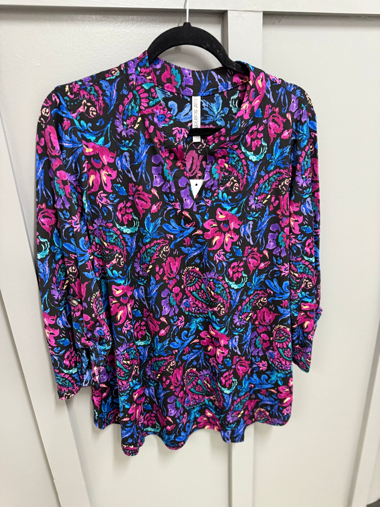 Transform your closet with the Lizzy Top. Made from Bulgari (slinky/cooling) fabric, this top features a gabby neckline and rolled sleeves with button tabs for a comfortable, yet eye-catching piece. The 3/4 sleeve and scoop hem add flow to the already stylish piece. Experience comfort and style in one with the Lizzy Top.