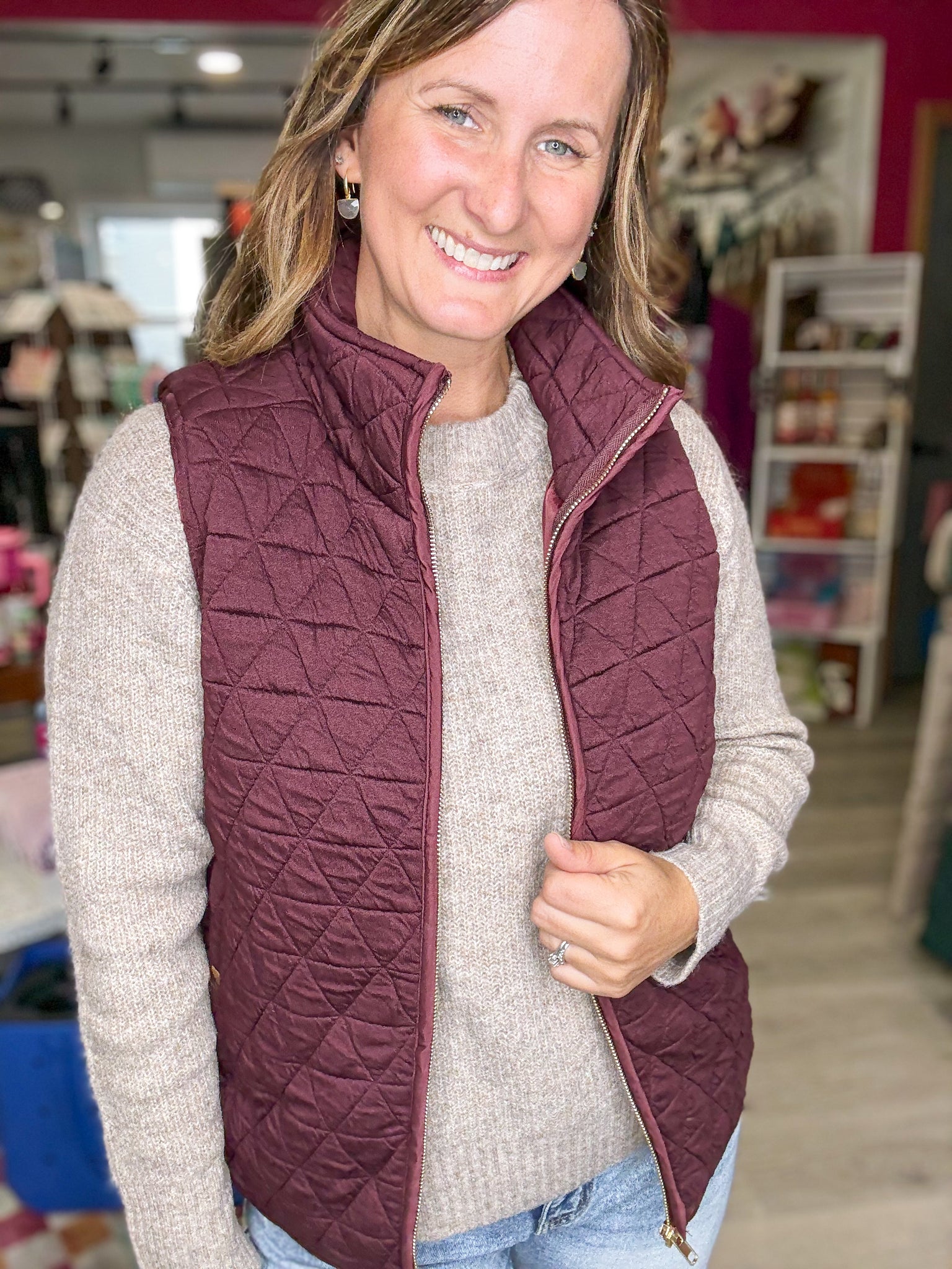 Burgundy Quilted Vest with Gold Accent