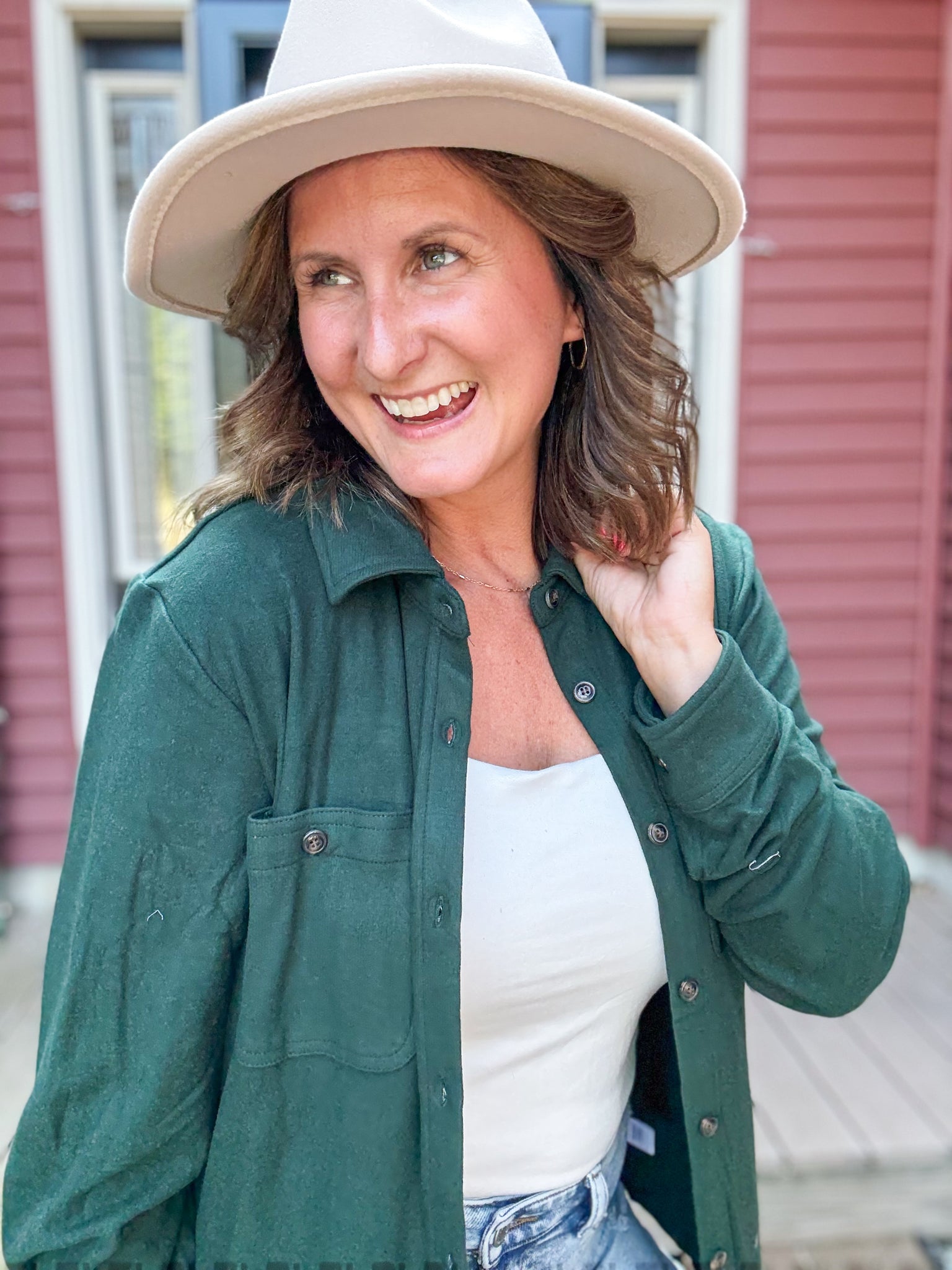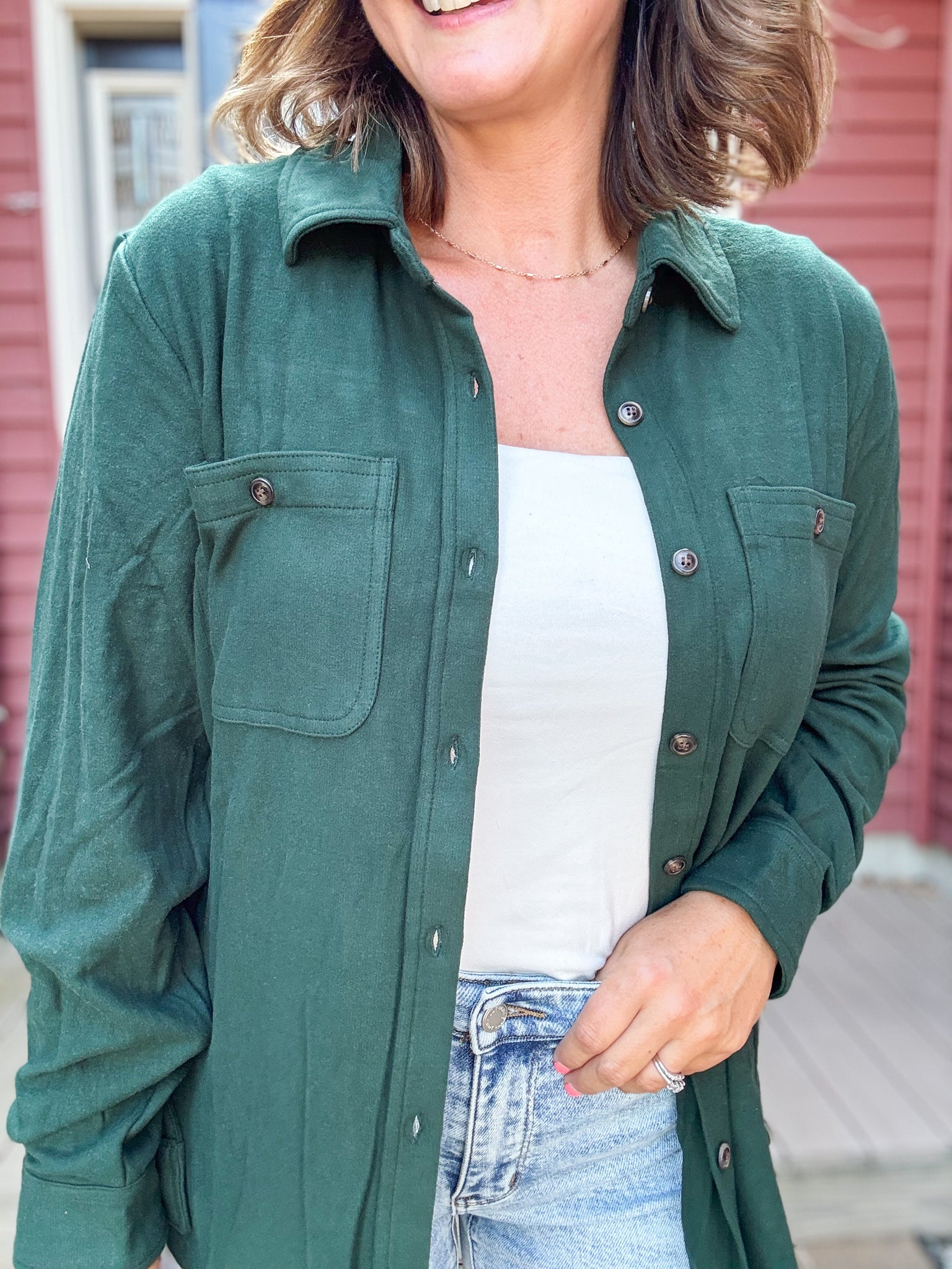 - More Oversized shirt fit vs. shacket (not as oversized as a shacket)