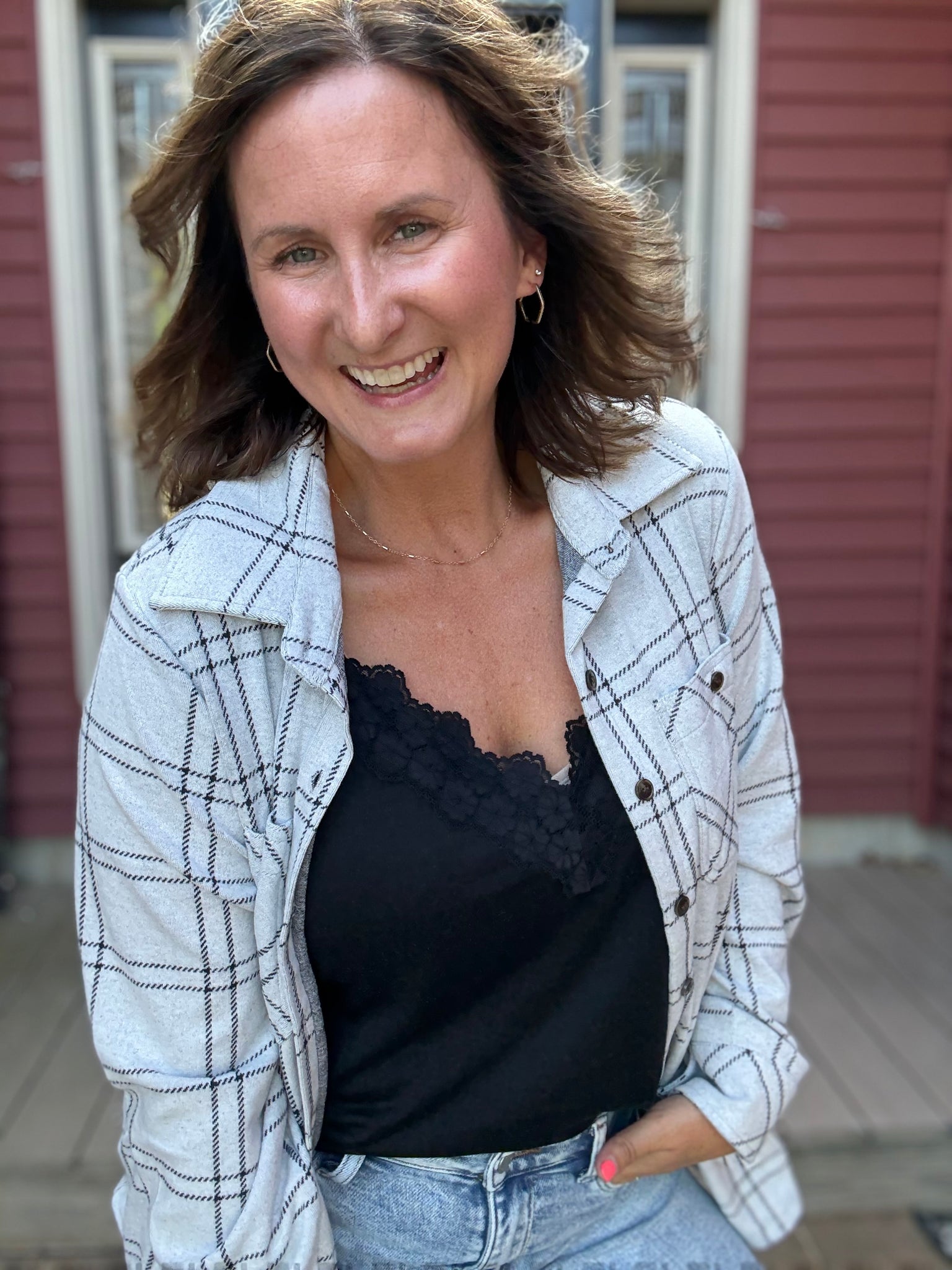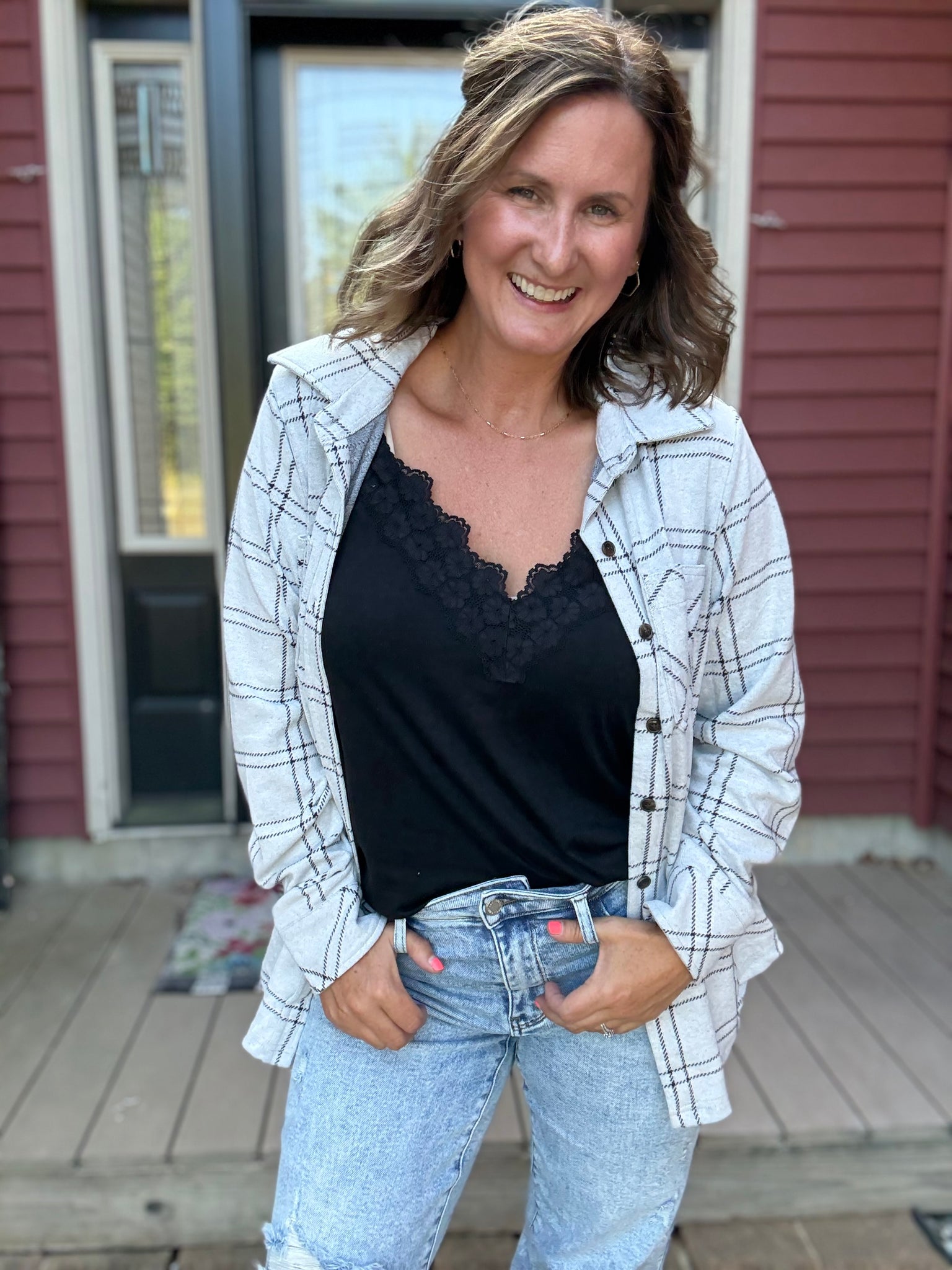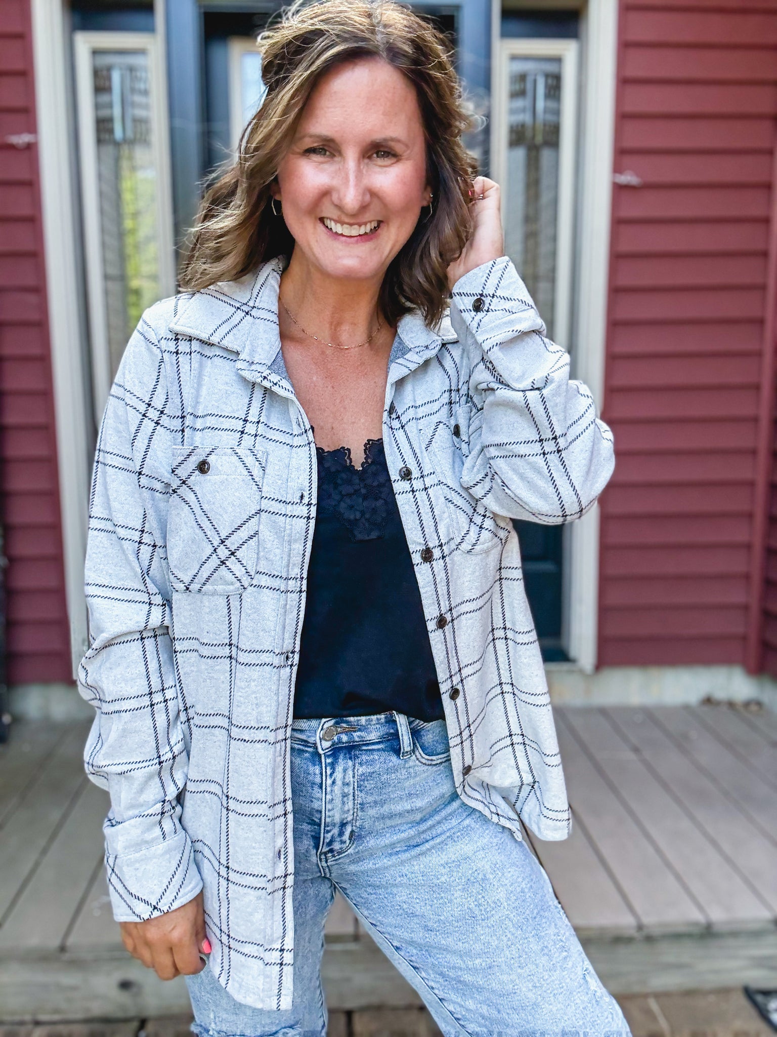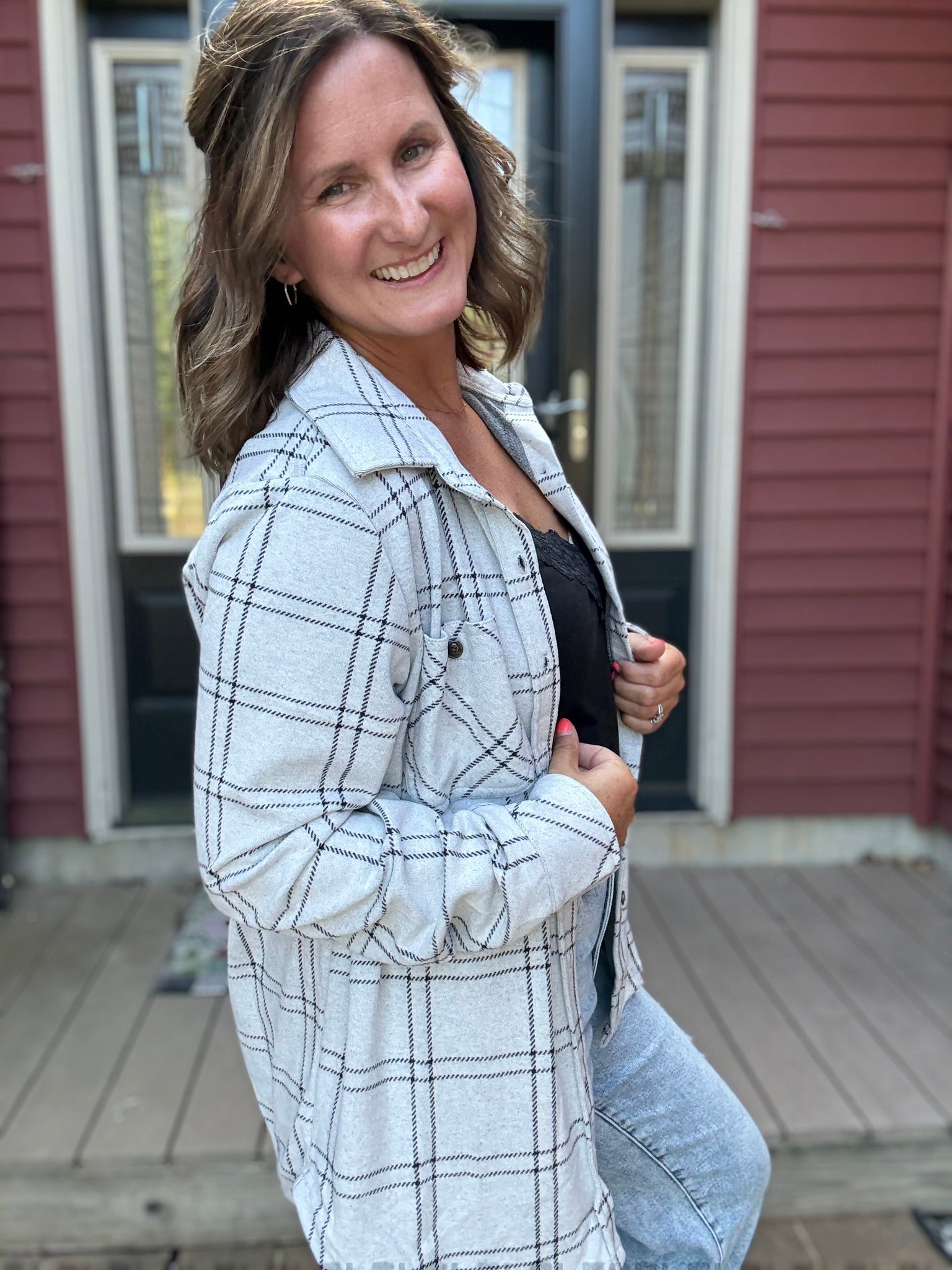 - More Oversized shirt fit vs. shacket (not as oversized as a shacket)