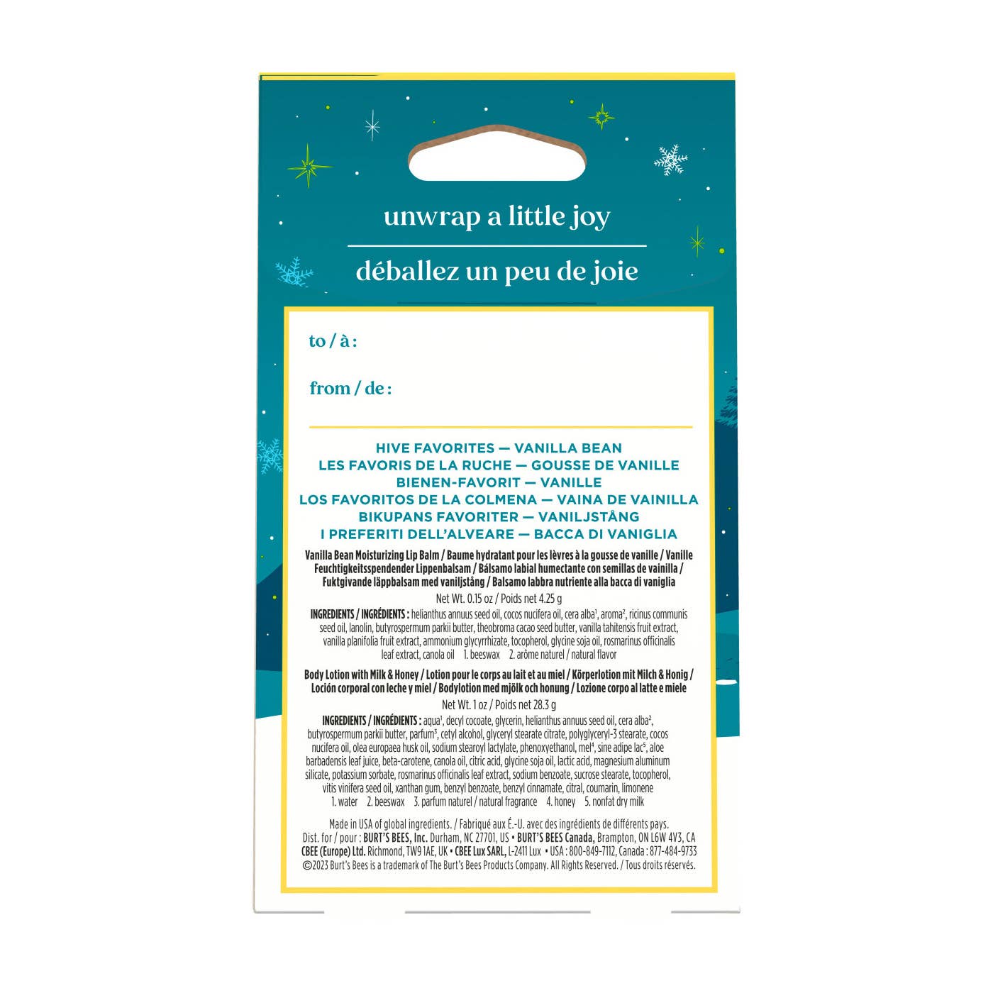 One pack of Burt's Bees Hive Favorites is a wonderful present with body lotion and moisturizing lip balm for men and women in a beautifully packaged holiday gift set.