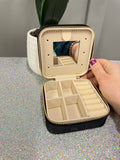 These feature a zipper closure, a 4 way small divider, several ring slots and hooks to hang necklaces!