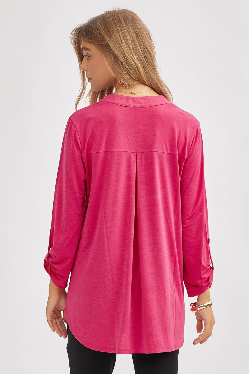 Transform your closet with the Lizzy Top. Made from Bulgari (slinky/cooling) fabric, this top features a gabby neckline and rolled sleeves with button tabs for a comfortable, yet eye-catching piece. The 3/4 sleeve and scoop hem add flow to the already stylish piece. Experience comfort and style in one with the Lizzy Top.