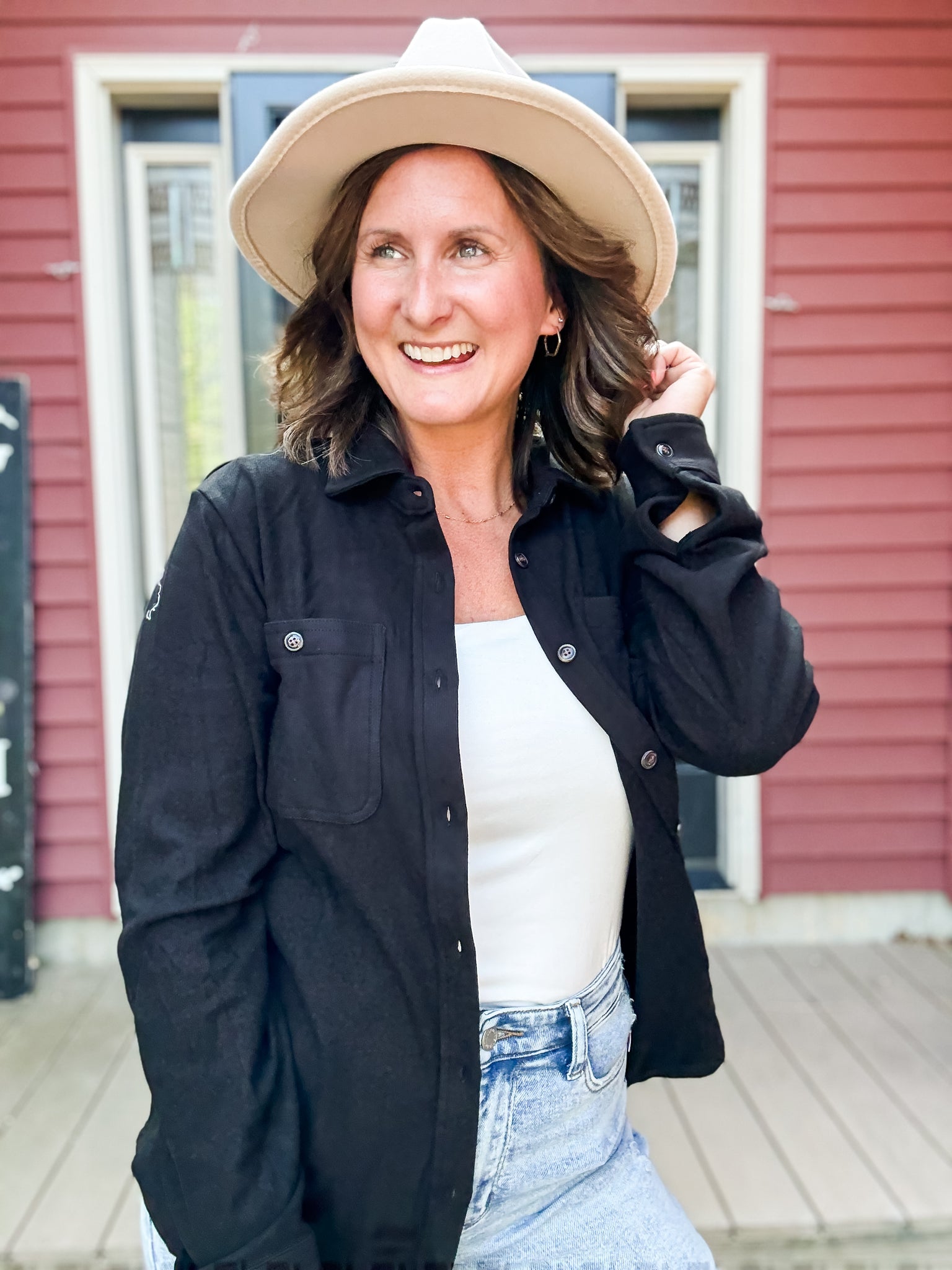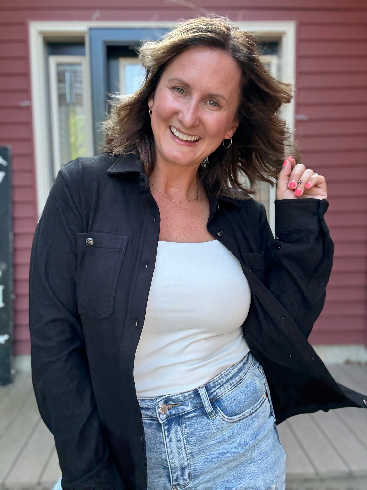 - More Oversized shirt fit vs. shacket (not as oversized as a shacket)