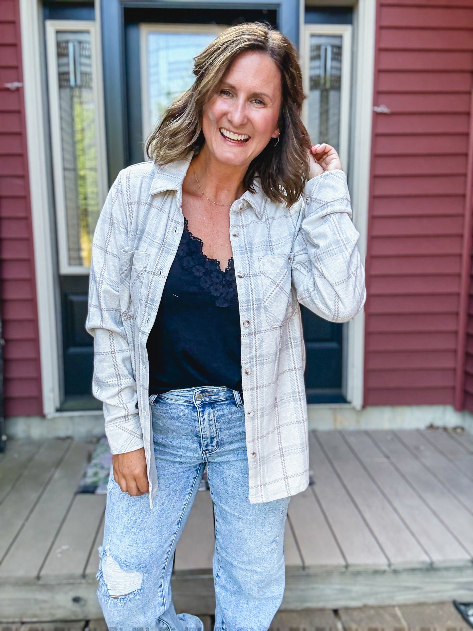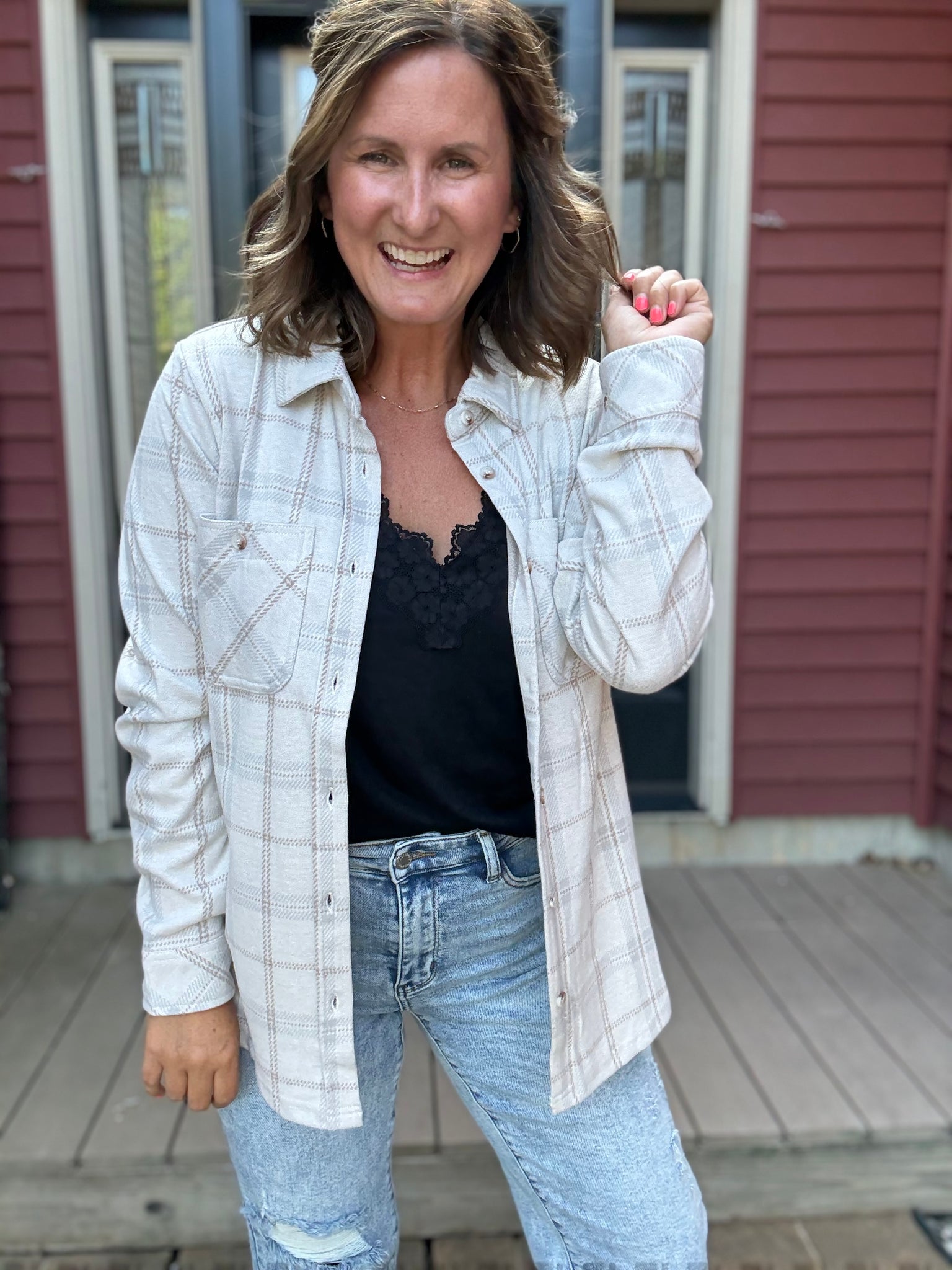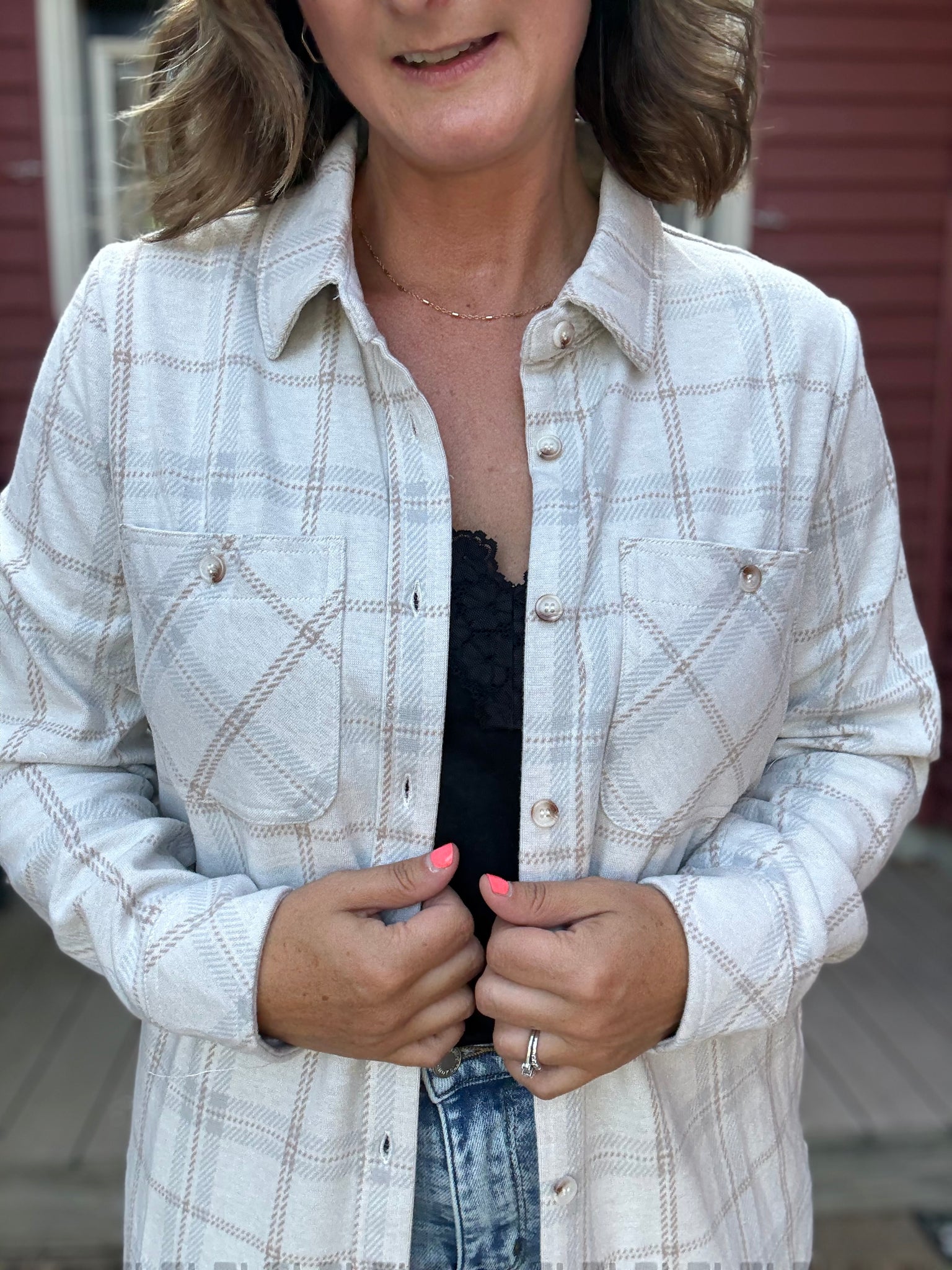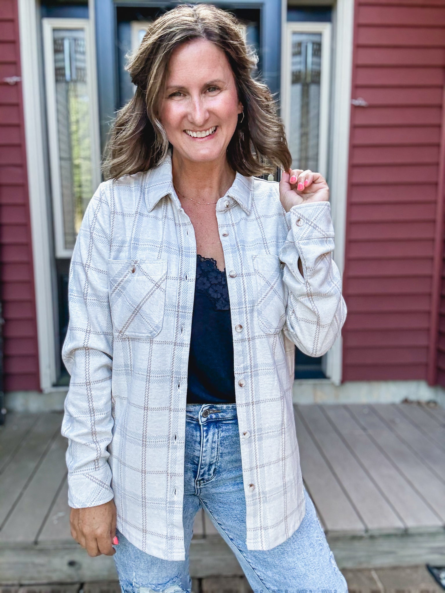 Kendra Shacket in Tan Oatmeal Grey Plaid